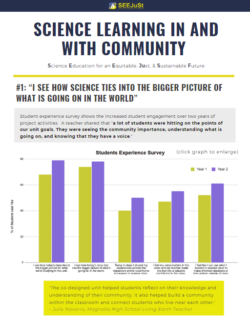 With this program, it really allowed me to think how I teach chemistry not just in this unit but as a whole…students were able to take all that they had learned throughout the whole school year to really affect change on an issue or ‘bothering’ that they felt strongly about.